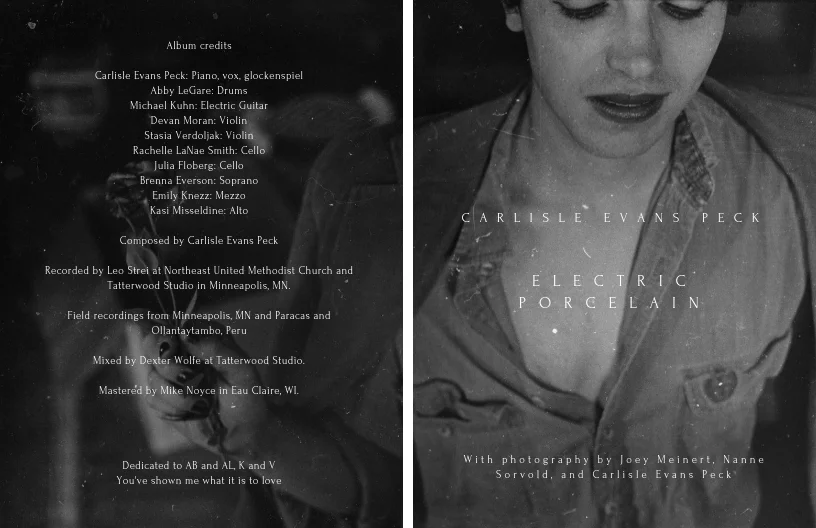 An 8 X 5” booklet including all the lyrics and poetry from Electric Porcelain, and featuring black and white photography from Joey Meinert, Nanne Sorvold, and Carlisle Evans Peck. Includes a digital download of the album.